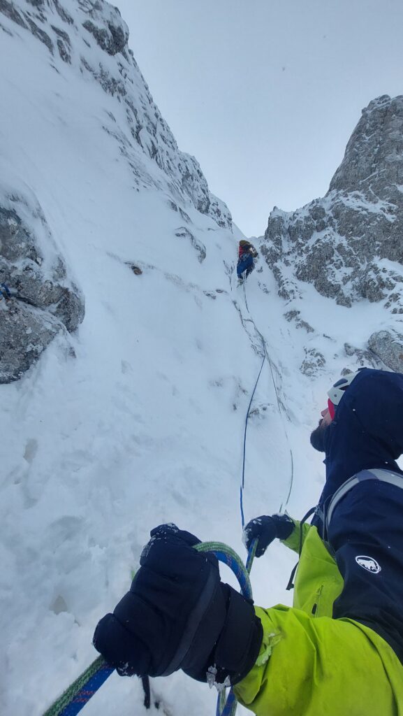 Trojna naveza podiže moral više nego dvojna. Tako sa potpunim rasterećenjem ulazimo u podnožje stijene koja je skoro cijela prekrivena snijegom, stvarajući ekstremne uslove. Pogotovo u vertikalama na kojima je mek snijeg, đe cepini i dereze nemaju funkciju.