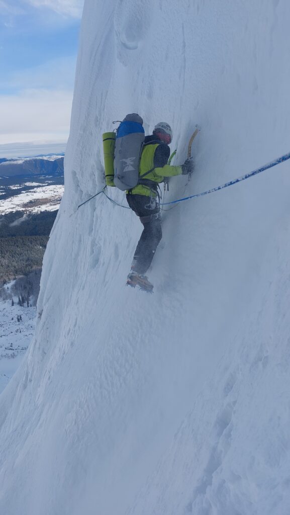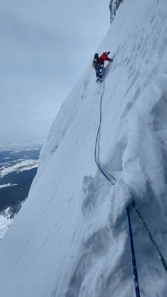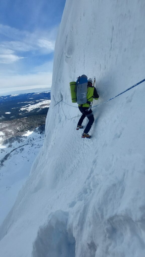Sjeverna stijena Savinog kuka, prvenstven smjer “Kako dron kaže” (Mješovita zimska varijanta) 350m, 85°/70°, 6h.