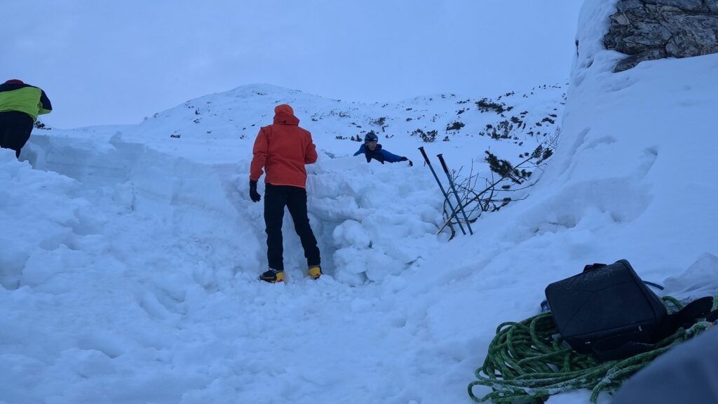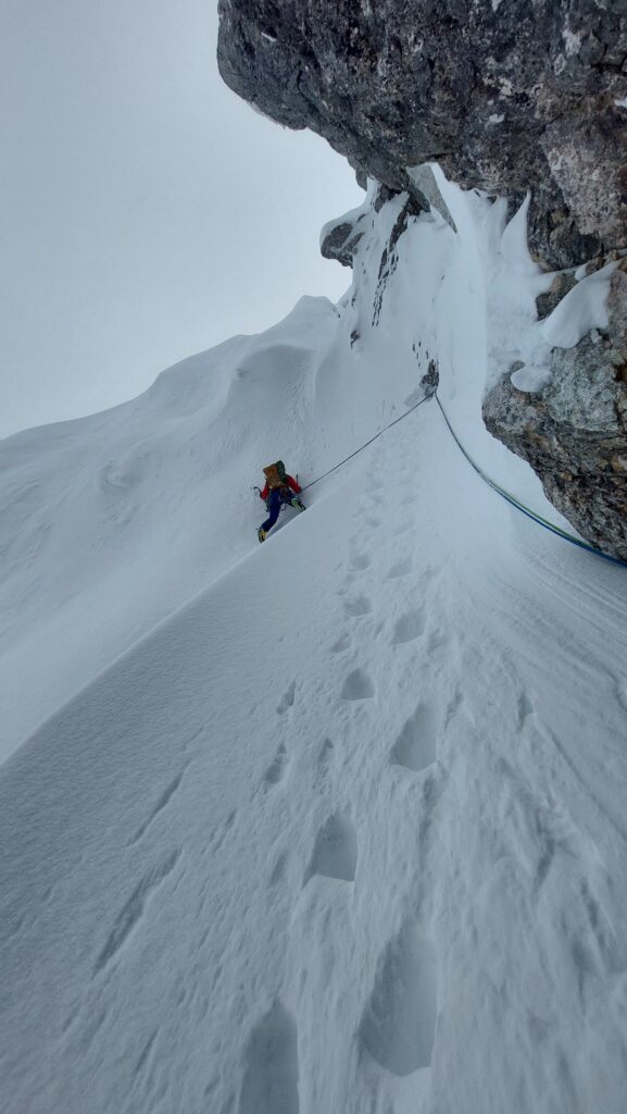 Zbog mekog snijega i nemogućnosti da ga savlada, priječi lijevo do vertikalnog sniježnog noža i nešto malo tvrđim snijegom penje gore.