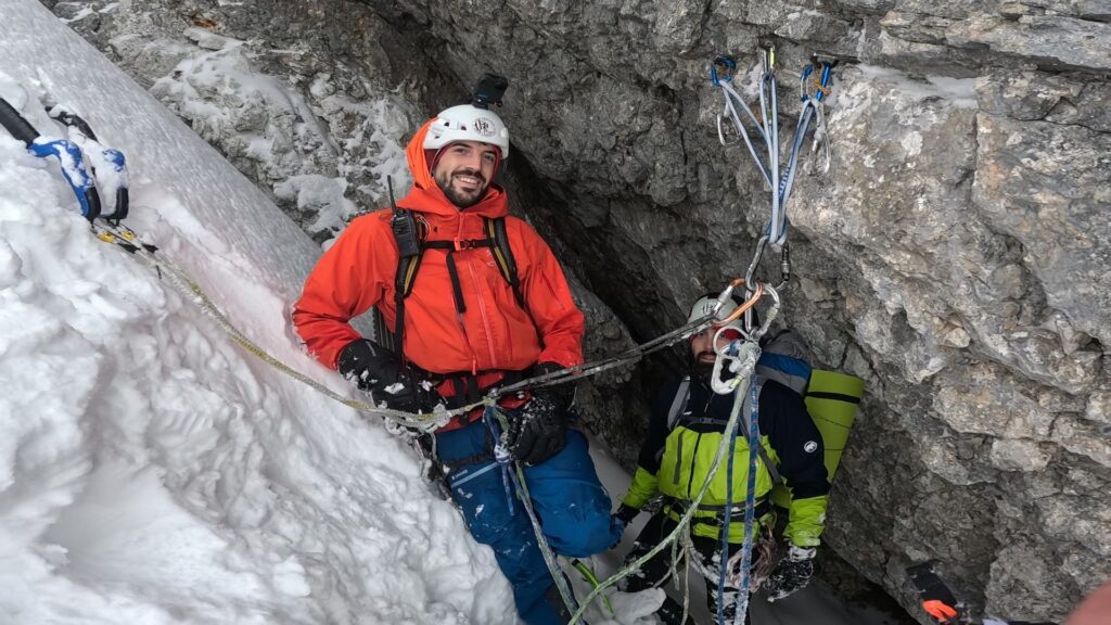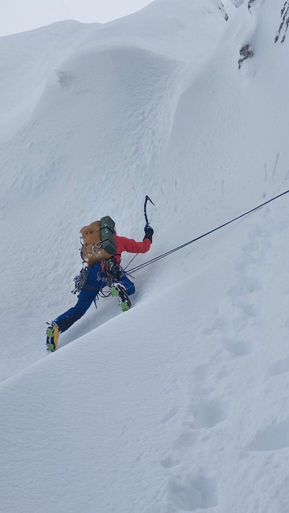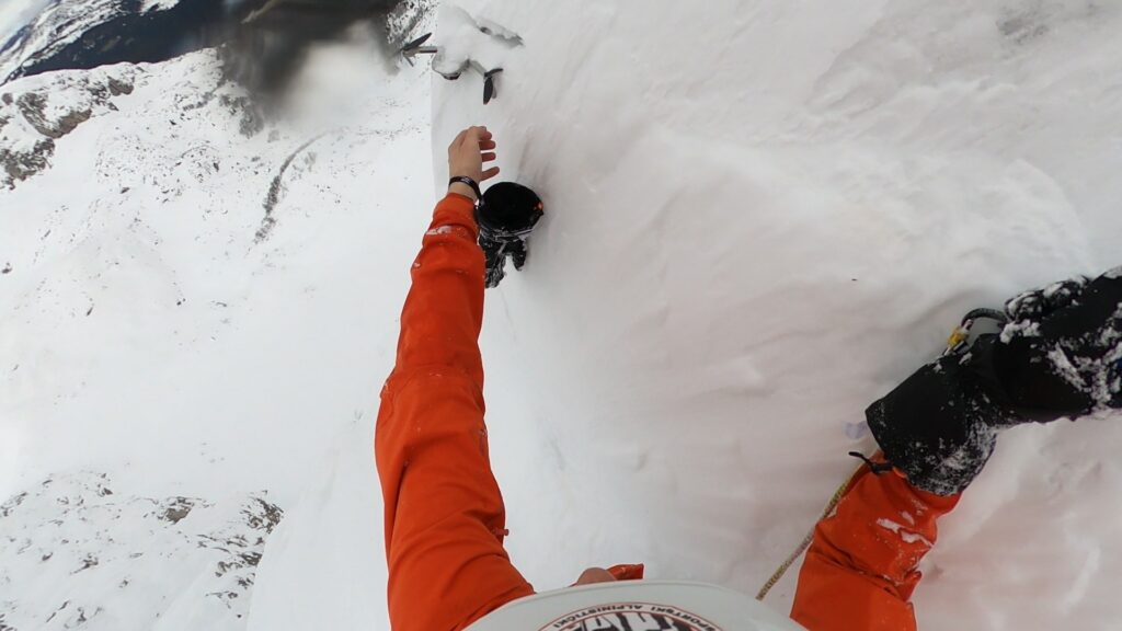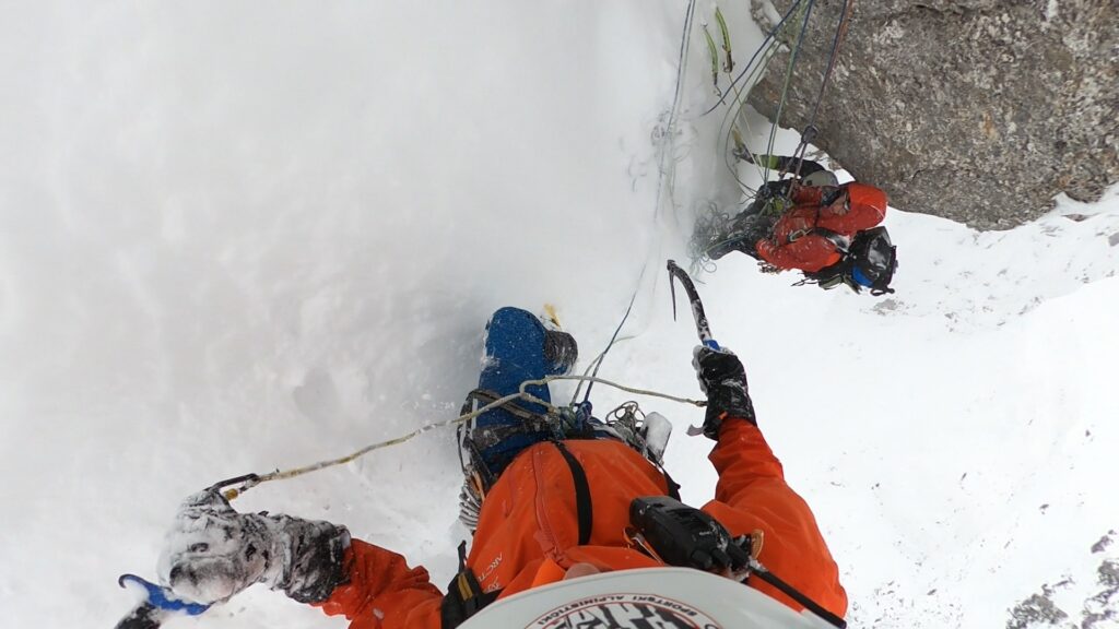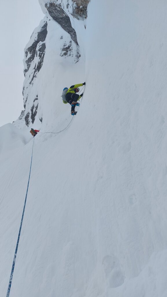 Problem u nardenih 90m je što nema stijene da postavi međuosiguranje i sidrište, već mora da kopa snijeg cepinom i rukama do 70cm debljine u vertikali da bi postavio sidrište u stijeni. Tako postupa u dva slučaja za sidrište.