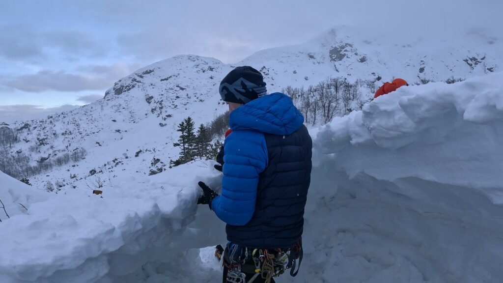 Lučnu stranu sniježnog nanosa visine 1,5m koristim za jedan zid, ostale strane zidamo kockama od snijega koje Vuk lopatom pravi u snijegu pored. Dejan podiže dron prije nego se navuku oblaci na sjevernu stijenu Savinog kuka, i snimi kuda sjutra ispenjati neku novu liniju smjera.