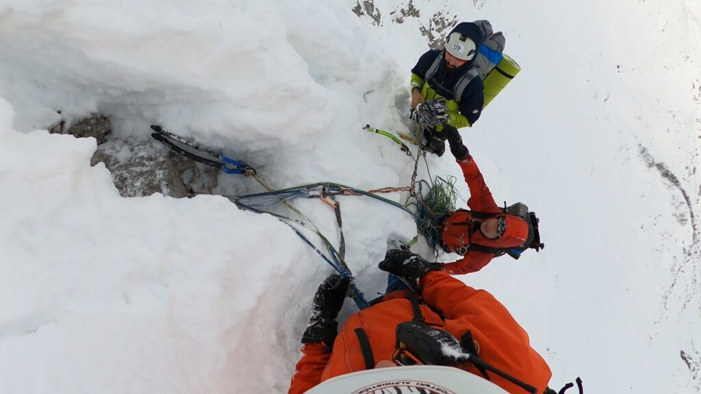 Dejan vodi navezu, penje lijevo ili desno veoma strme sniježne površine , samo da bi naišao na tvrđi snijeg u vertikali.