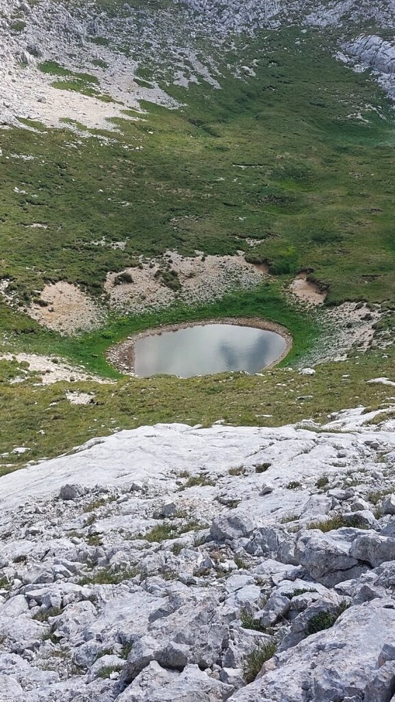 Poslije skidanja sidrišta Izlazim opet na vrh grebena sjeverne stijene zapadnog vrha Šljemena. Prvo što uočavam na zaravnjenom masivu Šljemena, manje jezerce okruglog oblika prečnika 15m.