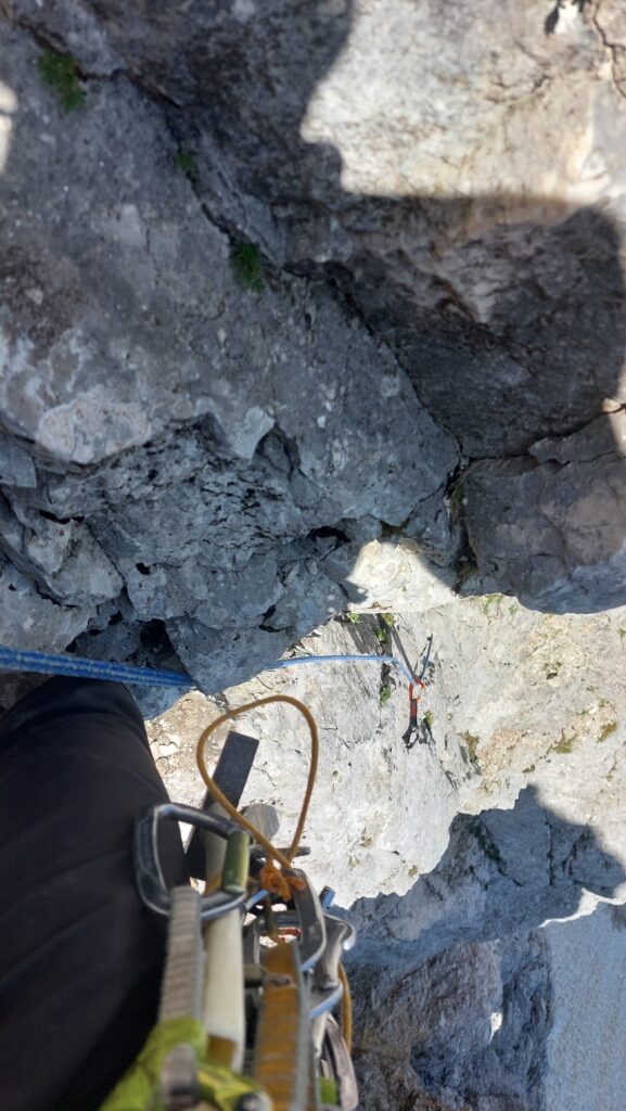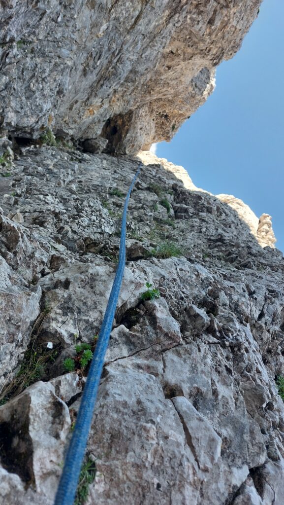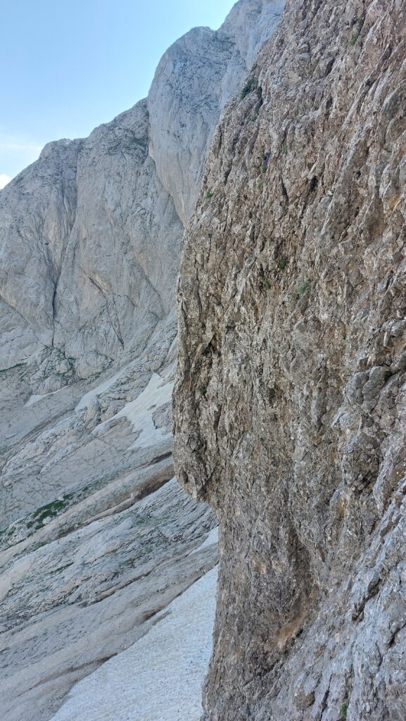 Izlaskom na otvorenu stijenu izbjegavam rastresiti previsni kamin koji se nalazi sa lijeve strane, penjem vertikalno po otvorenoj djelimično razvaljenoj stijeni ocjena V, tu ostavljam klin.