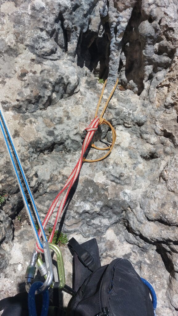 Na vrhu stijene postavljam sidrište da bih se spuštio abseilom i skinuo posljednje sidrište.