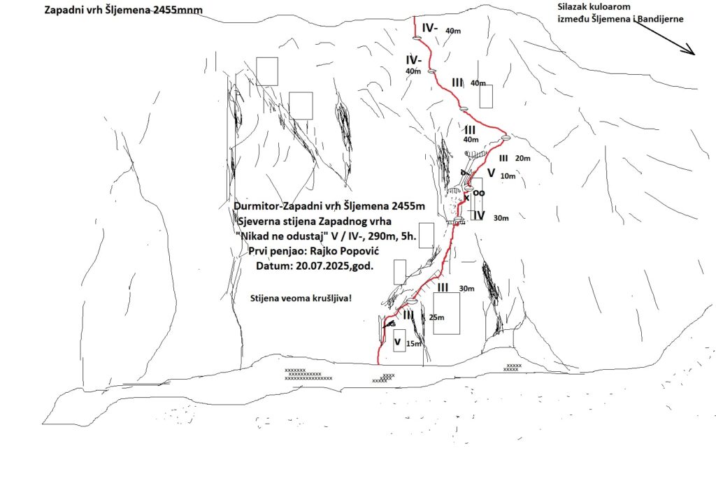 U sklopu planinarske ture koju je Tamara zvanično prvi put vodila poslije dobijanja licence Planinarskog vodiča, iskoristio sam boravak na Durmitoru da popnem prvenstven smjer u sjevernoj stijeni zapadnog vrha Šljemena “Nikad ne odustaj” V / IV-, 290m, 5h.