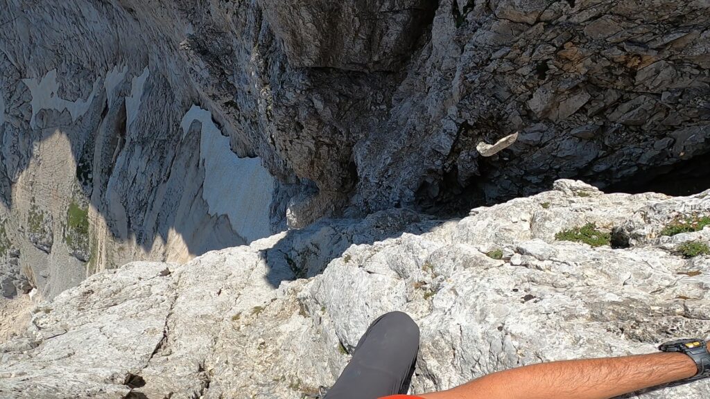 Poslije kraće pauze na vrhu idem u strmom kuloaru koji je opisan od strane prvih penjača u Smerkinom vodiču da je izvodljivo spuštiti se otpenjavanjem bez pomoći užadi.
